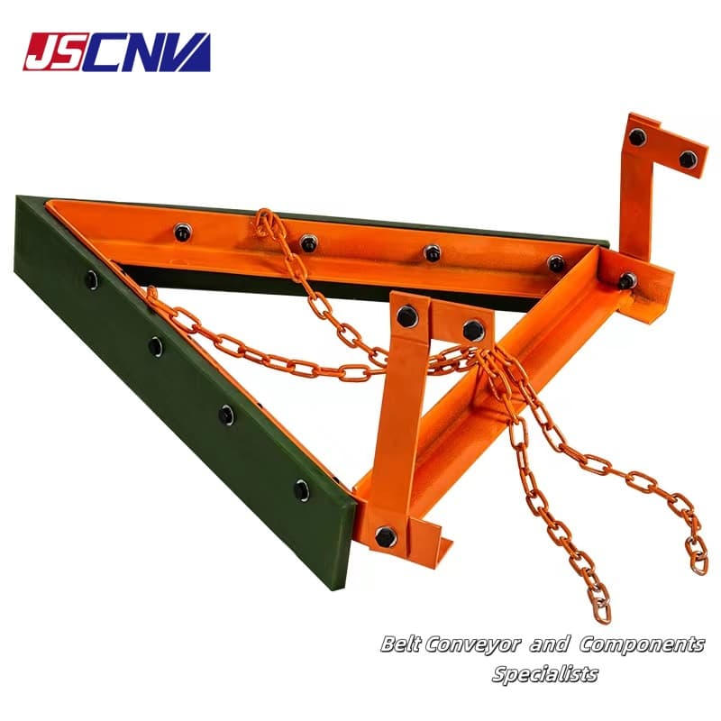 V-Plow beltahreinsari er tegund afturbeltishreinsara. Það er aðallega notað fyrir framan beygjuhjólið á færibandinu og fyrir framan þunga lóðrétta spennubúnaðinn. Það hefur einkenni sýru- og basaþols, logavarnarefni og andstæðingur, hár slitþol og skemmir ekki beltið. Blaðið er úr hástyrk pólýúretani, V-laga hönnunin tryggir hreinleika belta og sjálfvirka þyngdaraflhönnunin tryggir sjálfvirka uppbót þegar blaðið slitnar.